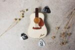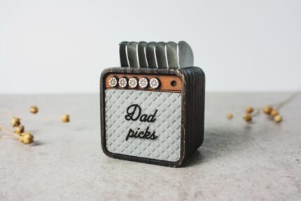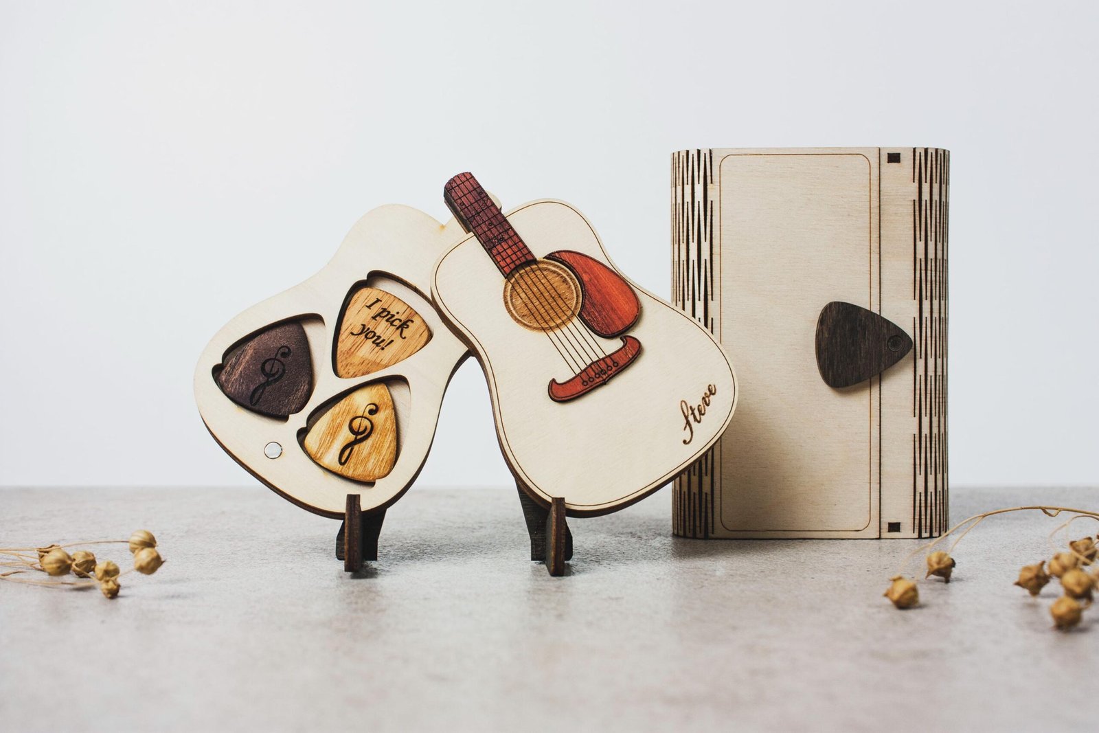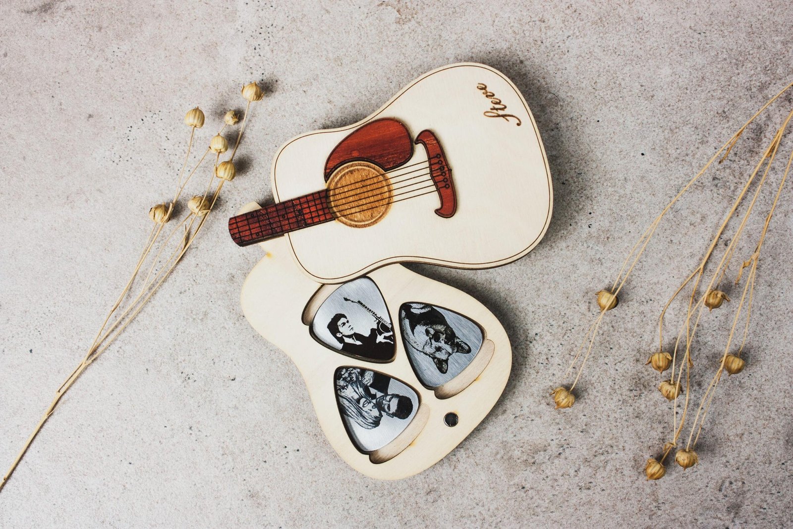 Faites de votre cadeau un moment inoubliable avec cette boîte à pioche en bois faite main ! Il a la forme d’une guitare, peut contenir plusieurs médiators et peut être personnalisé avec des noms ou des messages.